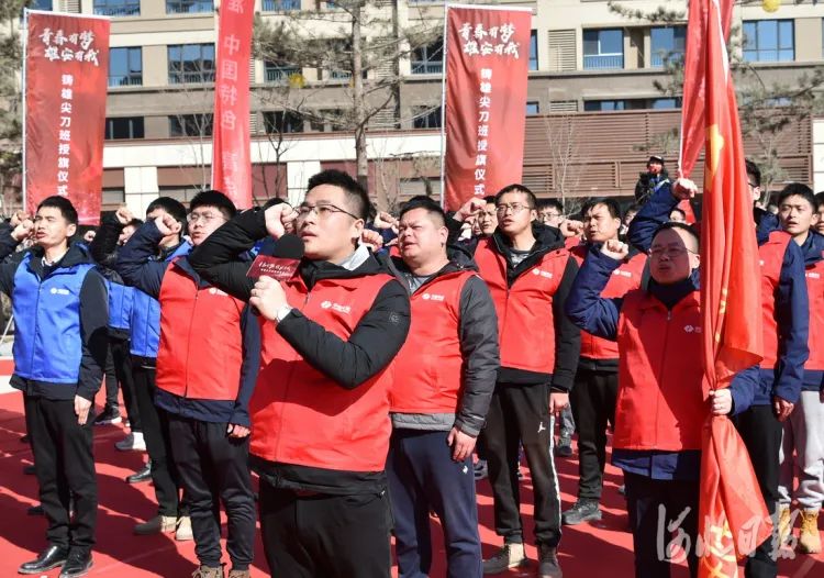 2022年3月2日,中国电建“青春有梦 雄安有我”铸雄尖刀班授旗仪式在雄安·容东智慧体验中心举行。 3月2日,中国电建“青春有梦 雄安有我”铸雄尖刀班授旗仪式在雄安·容东智慧体验中心举行。 雄安·电建智汇城项目地处雄安新区容东片区,既是承接疏解的重要支撑内容,也是新区开发建设的重点项目。该项目紧邻金湖公园,总建筑面积约171万平方米,涵盖写字楼、酒店、商业、居住产品、文化艺术园五大业态,集商务办公、休闲购物、社交娱乐、生活居住等功能于一体,将打造投建营一体化的标杆型示范区。 2022年3月2日,中国电建“青春有梦 雄安有我”铸雄尖刀班授旗仪式在雄安·容东智慧体验中心举行。图为尖刀班成员在宣誓。 2022年3月2日,中国电建“青春有梦 雄安有我”铸雄尖刀班授旗仪式在雄安·容东智慧体验中心举行。 雄安·电建智慧城项目铸雄尖刀班和金湖公园专类公园项目铸雄尖刀班由业务骨干和技术尖兵组成,他们将代表中国电建充分发挥勇于拼搏、爱岗敬业的精神,全身心地投入到雄安新区建设中来,确保项目按时保质完成,用实际行动为“千年大计、国家大事”奉献力量。
